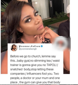 In a Twitter post made by the actress, she said slimming tea and waist trainer doesn’t give anyone a snatched body.