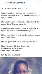 The Abia former governor announced this in a social media post on Monday. No reason was however given for her death. “With a heavy heart and pain, we announce the passing on to eternal glory of Mrs Ifeoma Ada Kalu aged 61 years. “She was a woman of virtue who was committed to the service of God and humanity”, the lawmaker stated. He further announced that a memorial service in her honour is scheduled to hold in the United States of America but no date was fixed. He urged the people of his constituency, Abia North and Nigerians in general to remember her and loved ones in prayers at these difficult periods. He also prayed for the peaceful repose of her soul.