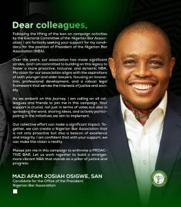 As a candidate for President of the NBA, Afam Asigwe pledges to prioritize the needs of all members, enhance professional development opportunities, and work towards a more transparent and accountable legal fraternity.