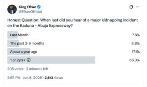 To assess public perception of safety along the Kaduna–Abuja Expressway—a corridor once notorious for high-profile abductions and violent attacks—Mr. Taye Paul Olubayo, a security and media consultant known on social media as @EfiweOfficial, conducted an online poll asking Nigerians: